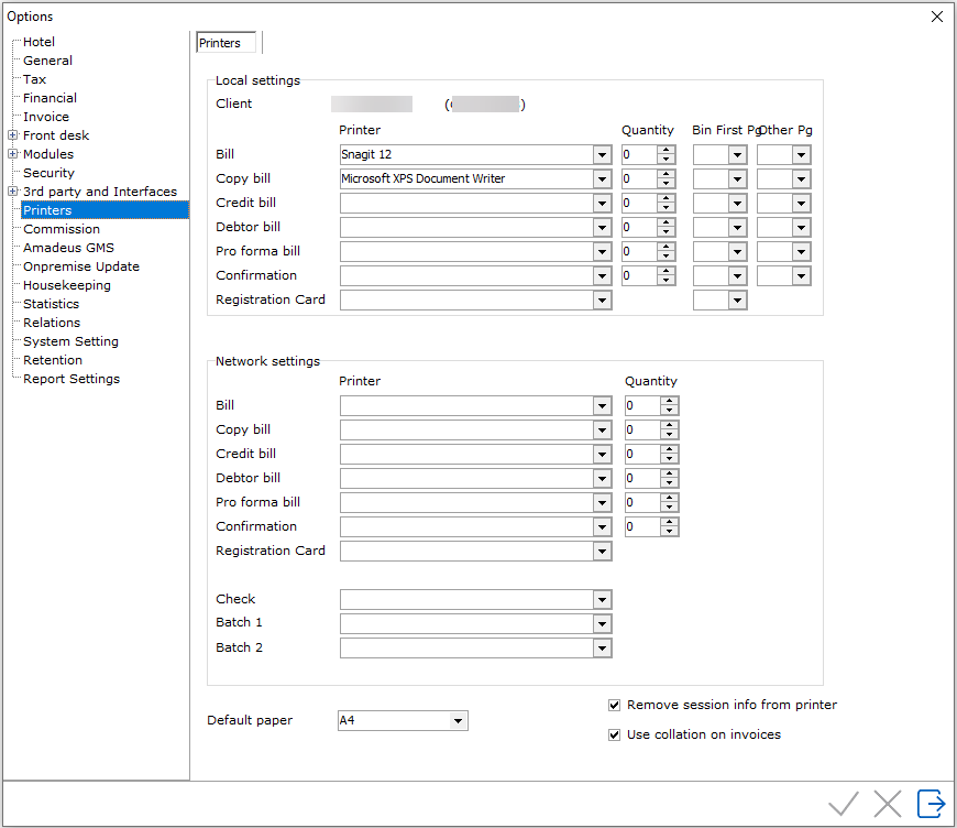 Printer Options allow for the configuration of printers within the IDPMS network. This section does not need to be filled if the property wants to use all the printer setting defaults. The settings would only need to be configured if the property requires specific documents or needs to allocate a specific quantity per invoice type.